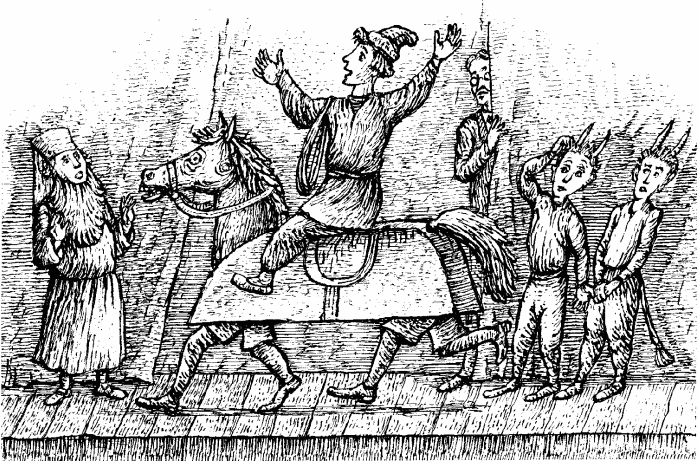 Лошадь была сделана из твёрдого картона, выкрашенного в рыжий цвет. Внутри лошади помещались два мальчика, один спереди, другой сзади. Первый просовывал свою голову в голову лошади и выглядывал оттуда через глазные дырочки. Голова лошади была прикреплена на винтах к туловищу, так что лошадь довольно легко могла двигать головой, и получалось это естественно, потому что и шея и винты были скрыты под густой гривой.