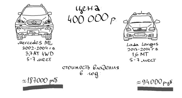 Вот вам более наглядный пример. За 400 000 рублей сегодня на рынке можно купить Lada Largus 2013—2014 года выпуска и Mercedes-Benz ML примерно 2003 года выпуска. У Мерседеса есть климат-контроль, полный привод, ксеноновые фары, кожаный салон, машина сама по себе больше, к тому же шильдик заставляет соседей завидовать и прочее, и прочее – одни плюсы на первый взгляд. Однако обратимся к цифрам. Транспортный налог на Ларгус обойдется в год от 1044 до 3150 рублей в зависимости от двигателя, а за Мерседес ежегодно придется платить от 7335 до 45080 рублей. Расходы на бензин при прочих равных: 56000 рублей в год у Ларгуса против 86000 у МL.