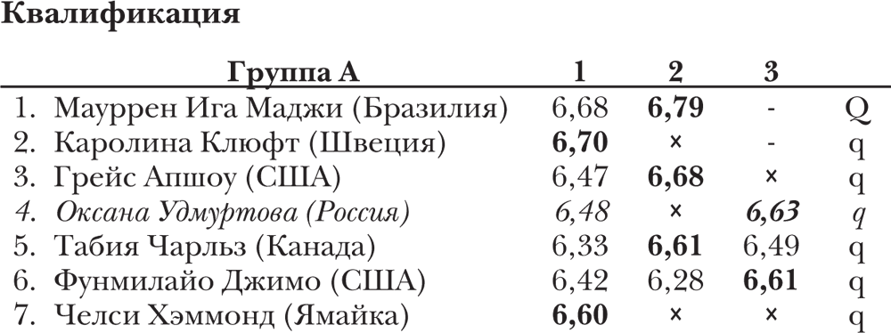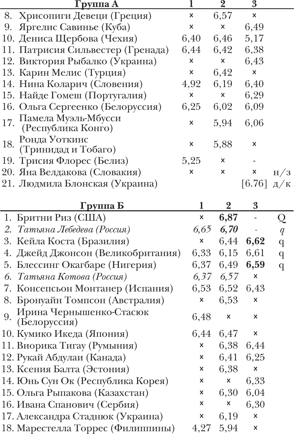 Только три прыгуньи сумели выполнить нужный норматив (6,75). Это американка Бритни Риз (6,87), бразильянка Мауррен Маджи (6,79) и украинка Людмила Блонская (6,76).