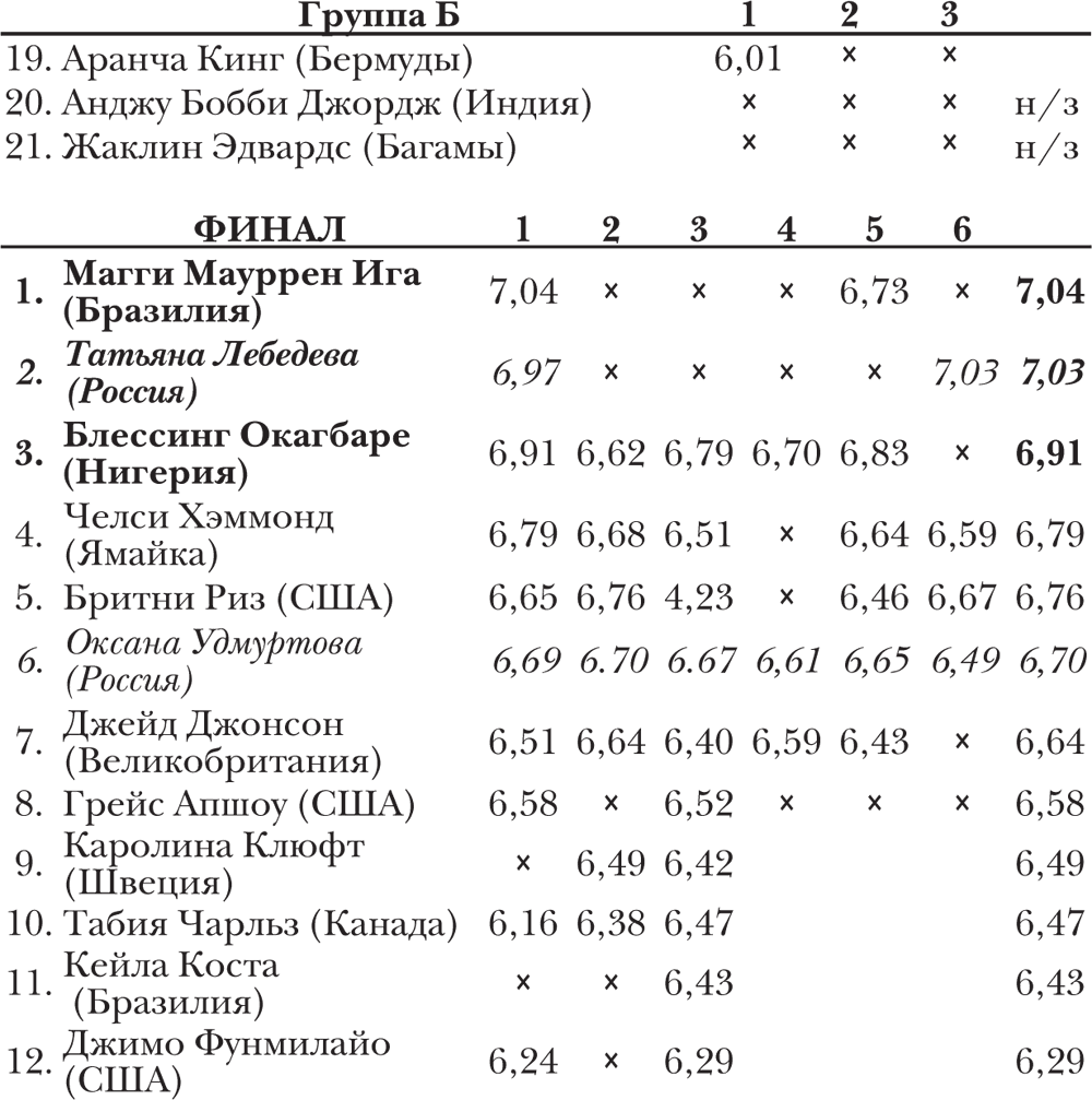 В первой же попытке финала претендентки на медали постарались показать все свои возможности. Татьяна Лебедева начала лучшим для себя результатом сезона – 6,97, но ее обошла Мауррен Маджи, приземлившаяся за 7-метровой чертой – 7,04. Затем Лебедева рисковала и заступила в следующих четырех попытках. Всем известен ее бойцовский характер, и действительно шестой прыжок получился без ошибок и далеким, но, увы, на сантиметр хуже – 7,03 (7,08 от места отталкивания). Не повезло.