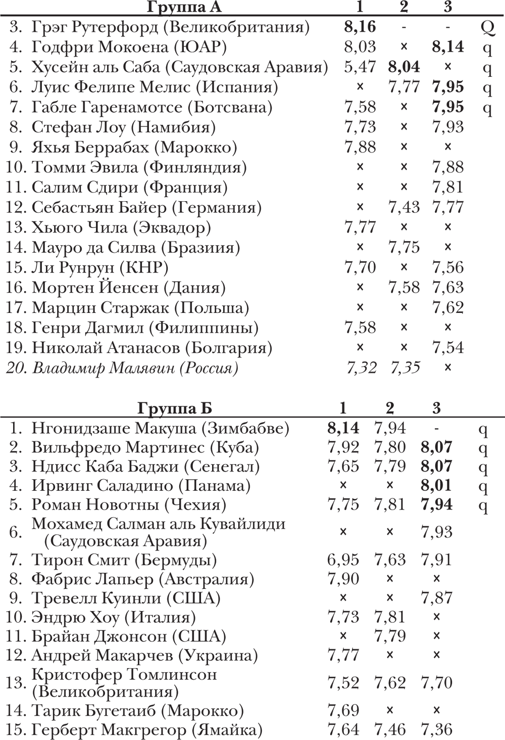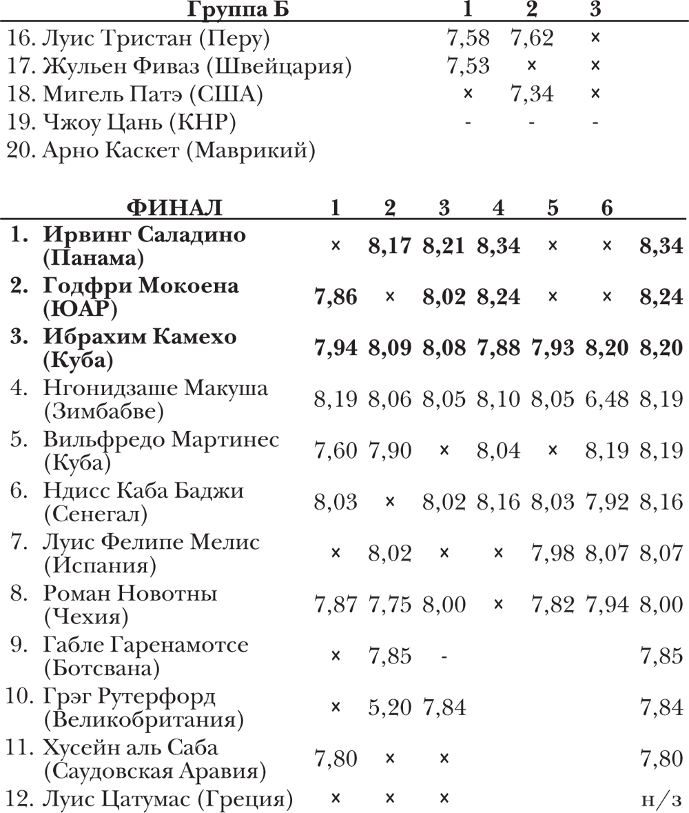 Так все оставалось до последнего «раунда», когда кубинец Вилфредо Мартинес улетел на 8,19, но Макуша, прибавивший в этом году с 7,69 до 8,30, еще оставался третьим по второй попытке. Однако Камехо прыжком на сантиметр дальше (8,20) вырвал у него бронзу.
