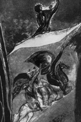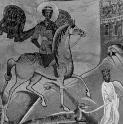 «Чудо Георгия о змие». Фреска в церкви Георгия в Старой Ладоге. Около 1167.