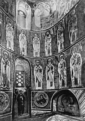 Церковь Спаса на Нередице близ Новгорода. 1198; росписи — 1199. Внутренний вид апсиды (снимок сделан до 1941).