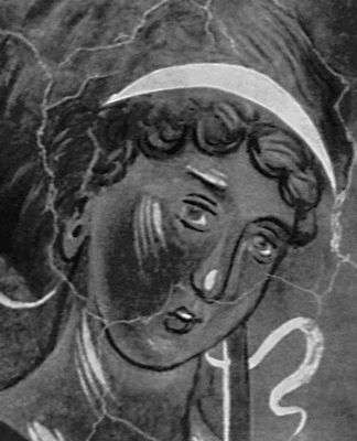 Феофан Грек. «Голова ангела» из композиции «Троица». Фреска в церкви Спаса на Ильине улице в Новгороде (фрагмент). 1378.