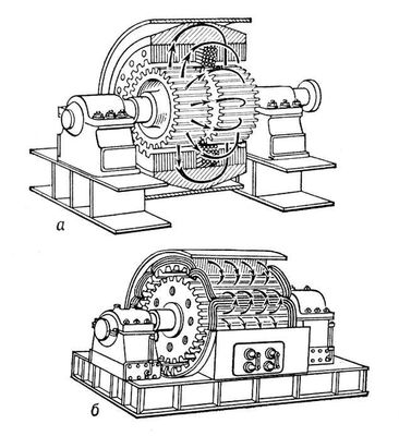 Генера'тор повы'шенной частоты' электромашинный, электрическая машина, преимущественно однофазная, генерирующая ток в диапазоне частот от 100 до 10000 гц (иногда выше) и применяющаяся главным образом в качестве источника питания установок индукционного нагрева металлов, ультразвуковой и транспортной аппаратуры. При частотах до 500 гц и больших мощностях (500 квт и более) применяют обычные явнополюсные синхронные генераторы с увеличенным числом пар полюсов. На более высокие частоты, особенно при малых мощностях, изготовляют только индукторные генераторы. По конструкции магнитной системы различают гомополярные и гетерополярные индукторные генераторы. Гомополярные машины (называются также одноимённополюсными, кольцевого типа или генераторами с продольным полем) имеют обмотку возбуждения постоянного тока в виде кольца, размещаемого между зубчатыми пакетами статора, и рабочую обмотку, заложенную в продольные пазы статора (рис., а). Каждый пакет статора и зубчатый венец ротора таких машин намагничены по всей окружности полярностью одного знака. Гетерополярные генераторы (называются иначе разноимённополюсными, сегментного типа или генераторами с поперечным полем) имеют обмотку возбуждения и рабочую обмотку, заложенные в продольные пазы статора (рис., б). Число магнитных полюсов чередующейся полярности по окружности расточки статора таких машин равно числу пазов обмотки возбуждения. Периодическая составляющая потока индуктирует переменную эдс в рабочей обмотке с частотой f = Zn/60 , где Z — число зубцов на роторе, n — частота вращения в об/мин.