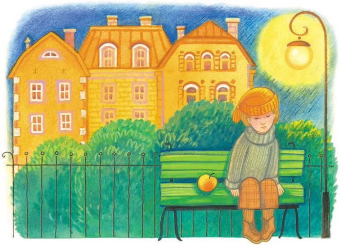 Интересно, кто же это и день и ночь в пути? И у кого в руке золотое яблоко? Тут я взглянул на яблоко, что мне дала тётушка Лундин. Яблоко было золотое. Теперь я могу поручиться: я держал в руке прекрасное золотое яблоко. Я почувствовал себя страшно одиноким и чуть не заплакал. Пошёл и сел на скамейку в парке Тегнера. Там не было ни души. Наверное, все ушли ужинать. Смеркалось, накрапывал дождь. В домах вокруг парка зажглись огни. В Бенкиных окнах тоже горел свет. Значит, он дома, вместе с папой и мамой, ест блины и горошек. Наверно, повсюду, где горит свет, дети сидят возле своих пап и мам. Только я здесь один, в темноте. Один, с золотым яблоком в руках. А что с ним делать, не знаю. Поблизости стоял уличный фонарь, свет от него падал на меня и на моё яблоко. Вдруг в свете фонаря на земле что-то блеснуло. Оказалось, это простая бутылка из-под пива. Конечно, пустая. Кто-то засунул в её горлышко кусок деревяшки. Может, это сделал один из тех малышей, что днём играют в парке.