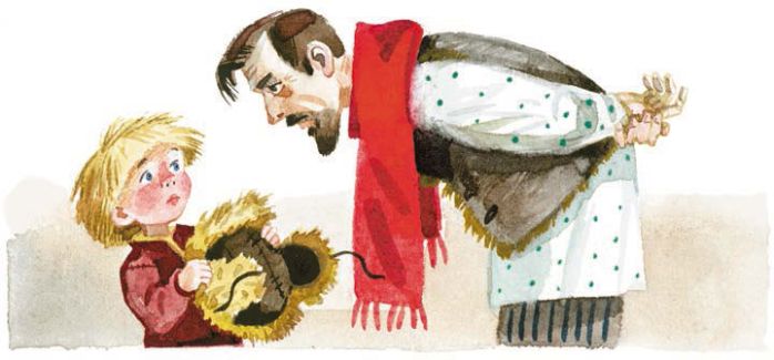 Стало Филипку скучно одному, бабушка заснула, а он стал искать шапку. Своей не нашёл, взял старую, отцовскую и пошёл в школу.