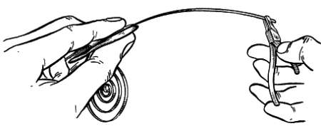 Фиг. 100. Чистка заводной пружины путем протягивания ее сквозь полотняную тряпочку.