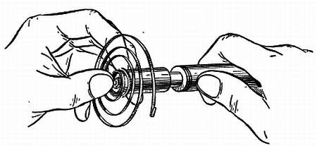 Для установки малых пружин в барабан закрепляют внутренний виток пружины на показанном выше приспособлении, а затем, держа барабан левой рукой, подставляют его к незаведенной пружине, начиная навивать ее. Когда диаметр пружины станет достаточно малым, барабан сделает небольшой скачок вперед. Замок пружины должен зацепить крючок в барабане. После этого барабан медленно поворачивают, чтобы пружина приняла нужное положение.