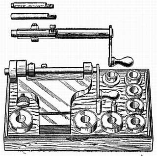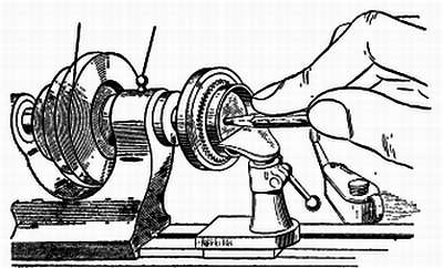Установив патрон на станке, к нему подводят спиртовку и после достаточного нагрева смазывают поверхность шеллаком, к которому приклеивают барабан.