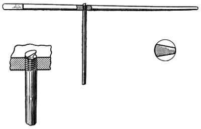 Отверстие сверлить лучше всего инструментом для снятия фасок. Пружину кладут на кусок твердого дерева и начинают обрабатывать указанным инструментом то место, где должно быть изготовлено отверстие до появления на другой стороне пружины выпуклости. Затем выпуклость спиливается, оставляя небольшое отверстие. Пружина очищается от окалины, после чего вставляют в отверстие отрезок мягкой стальной проволоки, как показано на фиг. 104.