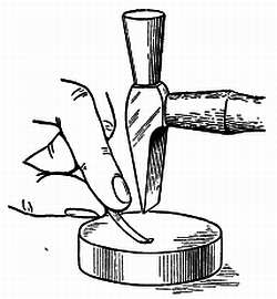 Конец пружины загибают по форме вала барабана. Для этого пружину кладут на металлическую подставку (фиг. 108) и расчеканивают ее кончик до нужной формы.