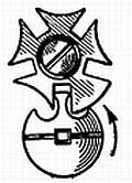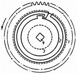 Это устройство имеет индикатор степени заводки пружины. Заводное колесо 1 имеет прорезь для пружины 2. Втулка 3 с прямоугольным отверстием 4 надевается на ось барабана и зацепляет пружину. Принцип действия заключается в том, что при заводке часов заводное колесо ведет пружину 2, которая заставляет вращаться втулку 3 и заводит заводную пружину. При полной заводке втулка 3 остается неподвижной, но заводное колесо можно заставить вращаться при проскальзывании пружины 2.