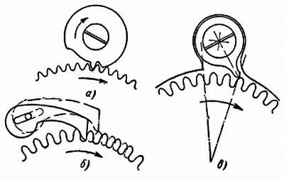 Попутно здесь необходимо остановиться на фиксирующей собачке, функцией которой является предупреждение срыва пружины с крючка при слишком тугом заводе. Возврату заводного колеса способствует раскручивание пружины. Другая система крепления имеет собачку с большим углом поворота, установленную в вырезе платины таким образом, что собачка запирает заводное колесо, упираясь своим вырезом в зубья колеса (фиг. 112).