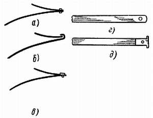 а — приклепываемый замок; б — замок с загнутым кверху концом; в — колонка; г — отверстие для зацепления за крючок барабана; д — Т-образная наладка.