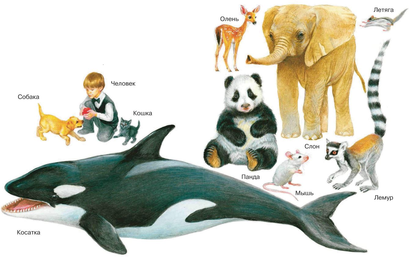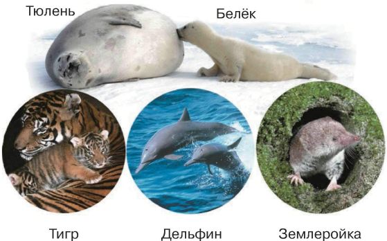 Животные, которых ты видишь на рисунке, вскармливают своих детёнышей молоком. Это млекопитающие животные. У большинства из них детёныши при рождении внешне похожи на родителей. Питаясь материнским молоком, малыши быстро растут. Самки долгое время их охраняют и воспитывают. Когда детёныши подрастают, родители обучают их охотиться, строить убежище, защищаться, прятаться от врагов, запутывать следы.