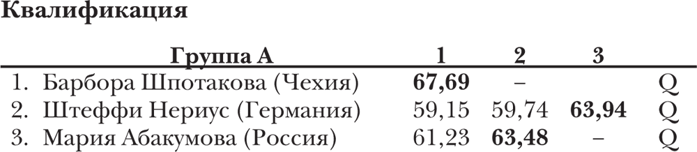 Рекордсменка России в метании копья Мария Абакумова во второй попытке метнула на 63,48 и также выполнила квалификационный норматив – 61,50, показав четвертый результат дня. Третий был у чемпионки Европы и серебряной медалистки Афин немки Штеффи Нериус – 63,94.