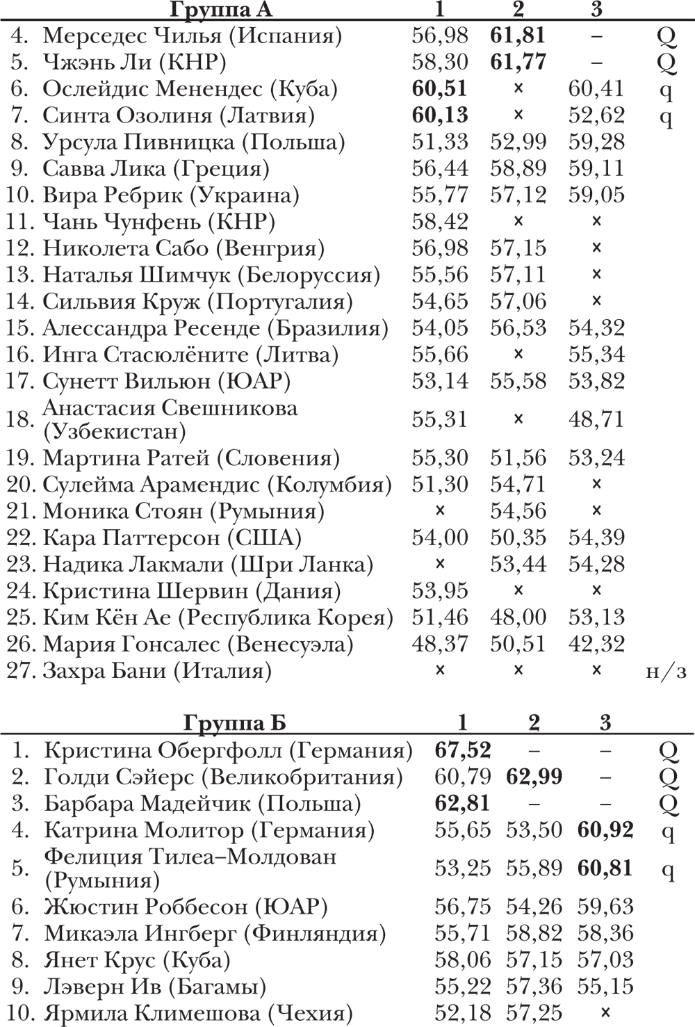 Олимпийская чемпионка 2004 года и рекордсменка мира (71,70) кубинка Ослейдис Менендес в этом году далека от лучшей формы. Метнув в первой попытке на 63,35, которая оказалось единственной ее удачной, она осталась шестой.