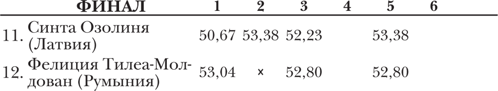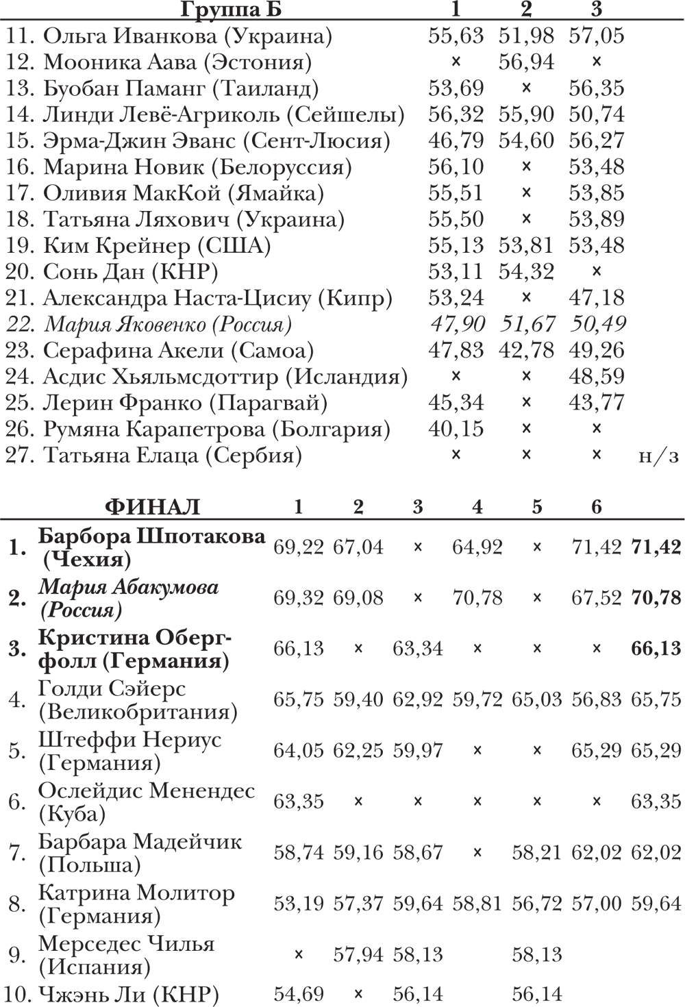 Прежнее достижение Обергфолл равнялось 70,20. Дальше метала только Менендес: 71,70 (2005), 71,54 (2001) и 71,53 в Афинах (2004). Казалось, это победа, но чемпионка мира Шпотакова совершает чудо. Ее копье в шестой попытке приземляется почти у линии мирового рекорда – 71,42 – и это еще один рекорд Европы. У Марии Абакумовой – серебро, но серебро высшей пробы. Обергфолл осталась третьей, Сэйерс – четвертой (с результатами первой попытки). Результат Сэйерс, как и у Нериус (65,29), – лучшие в истории для 4-го и 5-го мест.