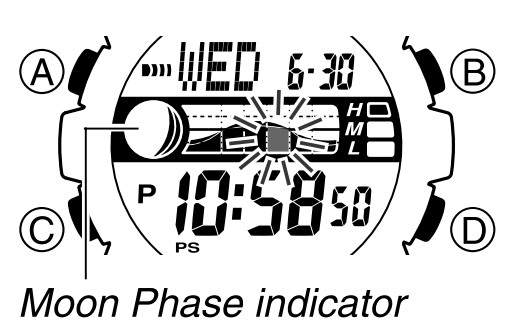 1. В Режиме Лунного Времени нажмите и удерживайте кнопку “А”. Изображение в разряде часов начнет мигать, что означает начало установок.
