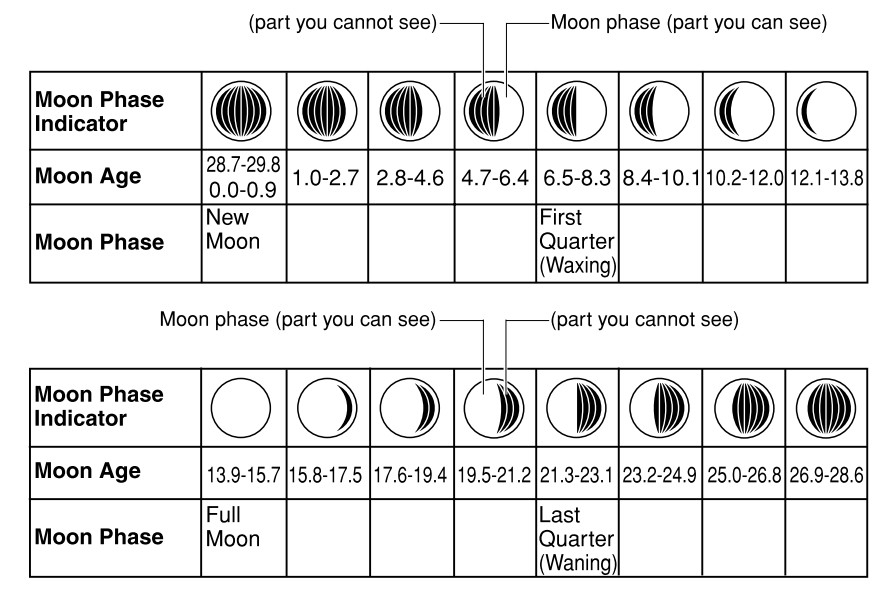 Правое-левое положение Луны (восточное-западное) зависит от того, располагается ли Луна к северу или к югу от Вас. Вы можете произвести данные действия, чтобы скорректировать положение на дисплее Луны так, чтобы оно совпадало с реальным положением Луны.