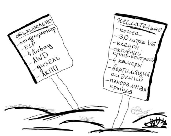 То есть, вы не купите машину с передним приводом, автоматом или без работающего кондиционера. Более того, вы рассчитываете на то, что зимние колеса не придется покупать отдельно, так как это дополнительные расходы. Вы будете в первую очередь смотреть машины с кожей, ESP, двигателем мощнее 150 л.с. и климат-контролем, но если вдруг найдется вариант без всего этого, вы его тоже купите без раздумий.